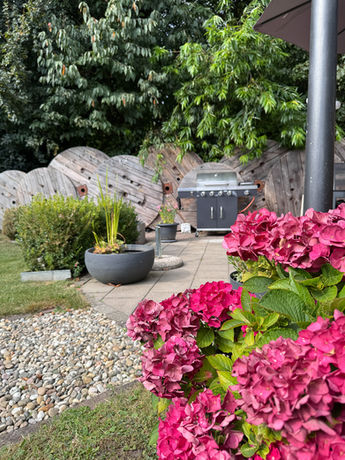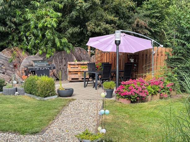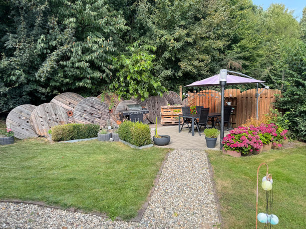 868 m² Grundstück mit sonniger Terrasse, Hot Tub-Bereich, Carport, Schuppen, Gartenhütte und Stellflächen – sogar für ein Wohnmobil. Plus: Wallbox für Elektroautos ist bereits installiert.