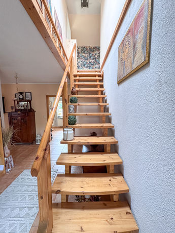 Baujahr: 2004 Grundstücksgröße: 868 m² Wohnfläche: ca 158 m² Anzahl Zimmer: 7 Anzahl Badezimmer: 1 Gäste-WC: 1 Energieausweis: Klasse C mit 79,4 kWh/(m²*a) *Bauweise: Holzblockbohlenbauweise mit zusätzlicher, isolierter Installationsschalung *Fenster: 2-fach Isolierglas, Mahagoni-Holzrahmen *Dach: Satteldach mit Betondachsteinen, gedämmt (200 mm + 180 mm Mineralwolle) *Heizung: Gas-Brennwerttherme mit Fußbodenerwärmung (außer Büro & Gäste-WC) + Heizkörpern *Grundriss: Barrierefrei & rollstuhlgerecht, großzügig geschnitten *Zimmer: EG: 4 Zimmer, Küche, Abstellraum, Hauswirtschaftsraum, Bad, Gäste-WC *Dachgeschoss: 1 Zimmer + Ausbaureserve *Bäder: modernes, ebenerdiges Badezimmer + separates Gäste-WC *Bodenbeläge: Laminat, Fliesen, Designspachtel im Bad *Wände: Tapeten, teils Putz/Glattspachtel Außenbereich: Gepflegter, großzügiger Garten *Terrasse + Hot Tub-Bereich *Rot gestrichene Gartenhütte im skandinavischen Stil *Carport + angrenzender Schuppen *Großzügige gepflasterte Stellflächen (PKW + Wohnmobil) *Bereits installierte Wallbox für Elektroautos *5000 Liter Regenwasserzisterne. Technik: Elektrik sowie Wasser- und Heizungsleitungen in Kupfer (Baujahr entsprechend) Besonderheiten: *Hochwertiger Baustil mit natürlichen Materialien *Barrierefreier Wohnkomfort für alle Lebensphasen *Ausbaureserve im Dachgeschoss für zusätzlichen Raum